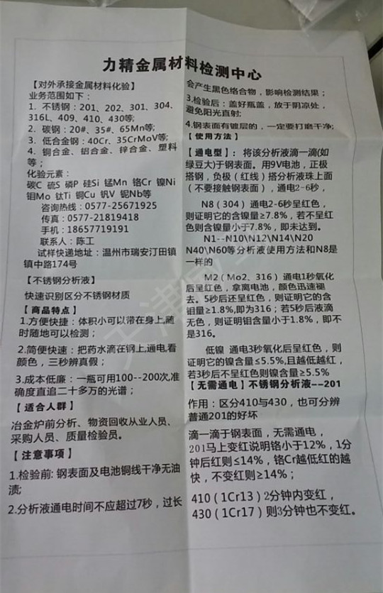 2.使用時(shí):滴一小滴于不銹鋼表面,用9V電池,正搭鋼,負(fù)搭測(cè)定液珠上面,通電要迅速,紅色一出現(xiàn)立即停止通電(如果通電時(shí)間過長(zhǎng)會(huì)產(chǎn)生黑色絡(luò)合物,影響檢測(cè)結(jié)果)