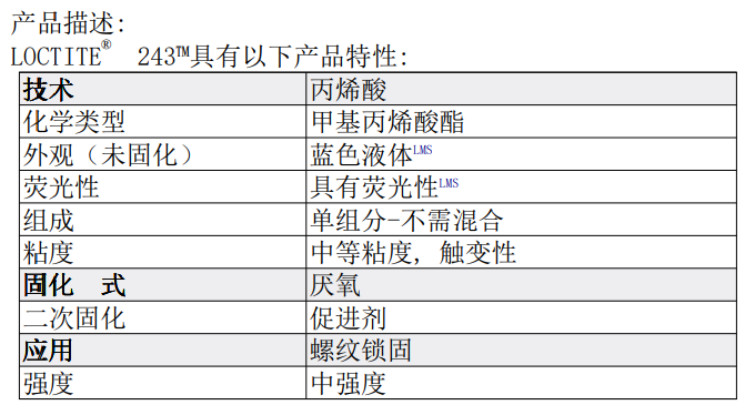 LOCTITE243通用型中等強(qiáng)度螺紋鎖固膠,適用于所有金屬螺紋組件。
